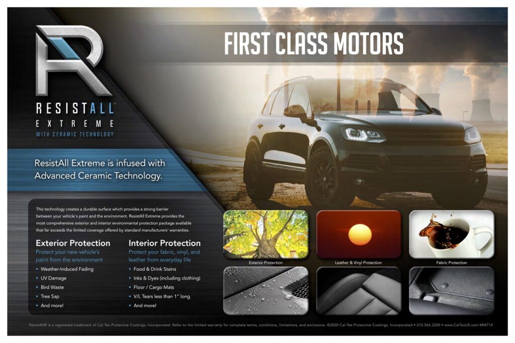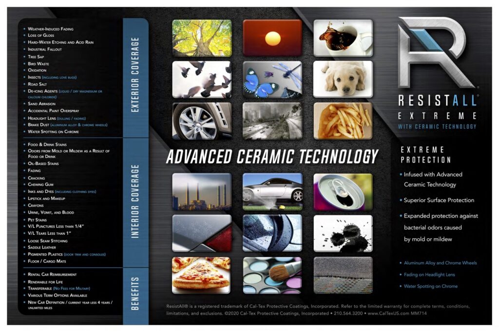 ResistAll Extreme is infused with advanced ceramic technology. This technology creates a much harder surface which provides a stronger barrier between your vehicle’s paint and the environment. ResistAll Extreme provides the most comprehensive environmental protection package available for the exterior and interior of your vehicle, that far exceeds the limited coverage offered by standard manufacturer’s warranties.